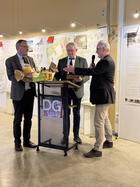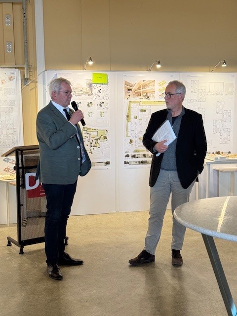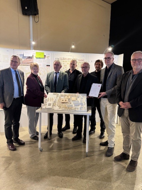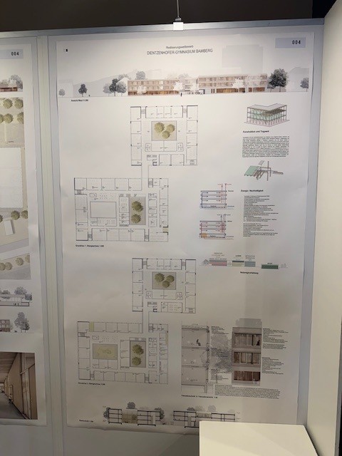 Über 100 Architekturbüros hatten sich für den Neubau des Dientzenhofer-Gymnasiums beworben, 15 Büros durften am Ende ihre Entwürfe einreichen. Der Zweckverband Gymnasien Stadt und Landkreis Bamberg lud als Auslober des Wettbewerbs die Finalisten zur Preisverleihung am 24. Februar 2025 ins Dientzenhofer-Gymnasium ein. Zusammen mit den Partnern unserer Arbeitsgemeinschaft – Ulrich Manz von umarchitekt und Christian de Buhr von DE BUHR LA Landschaftsarchitektur – nahmen wir die Urkunde zum 2. Preis entgegen.